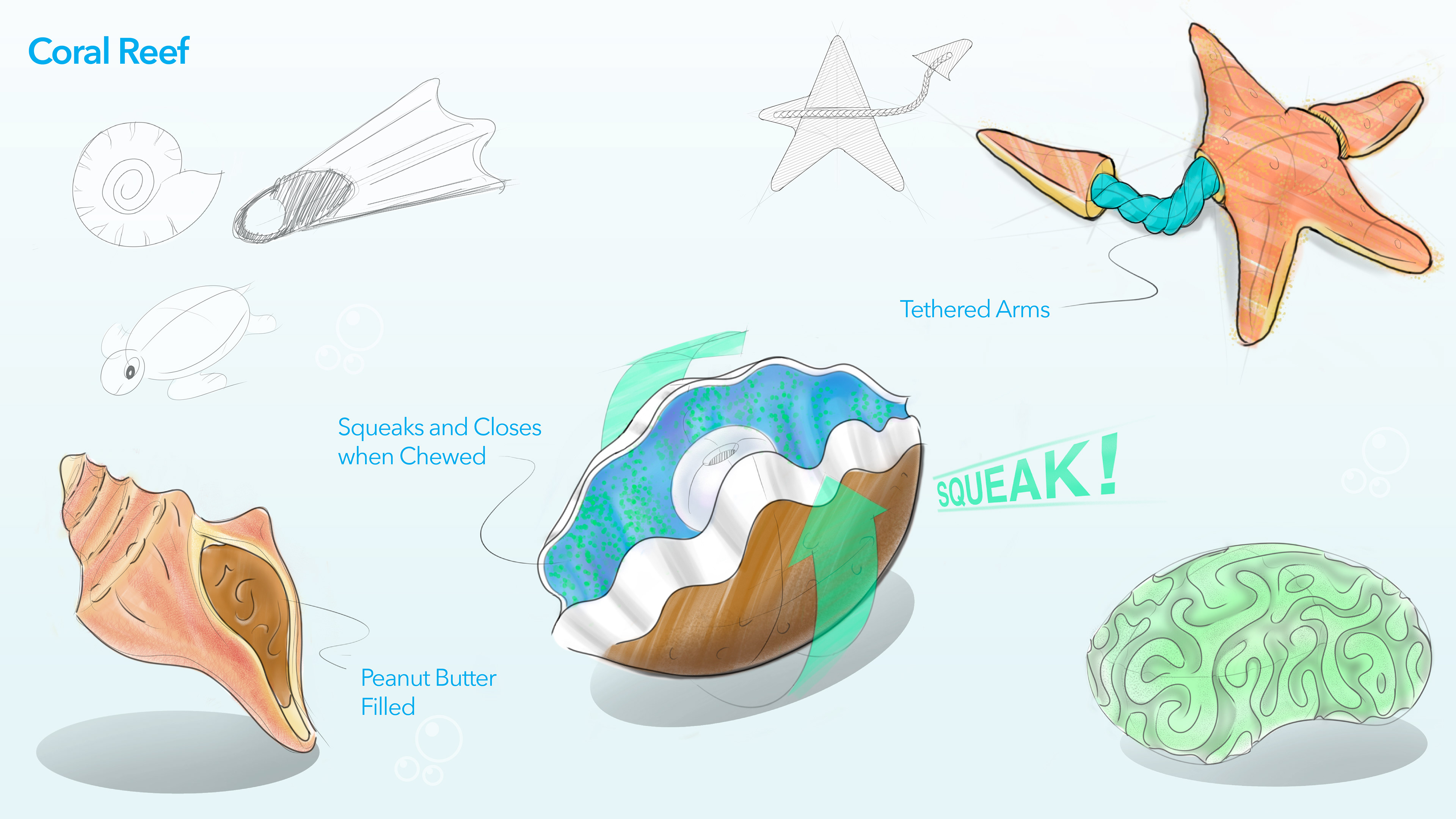 After showing the initial concepts I was asked to expand on the under water theme and develop some other toys. Some of the ones that stood out were a giant clam that would squeak and close when chewed, a star fish with 'self healing' arms connected by a rope, and a peanut-butter filled conch shell.
