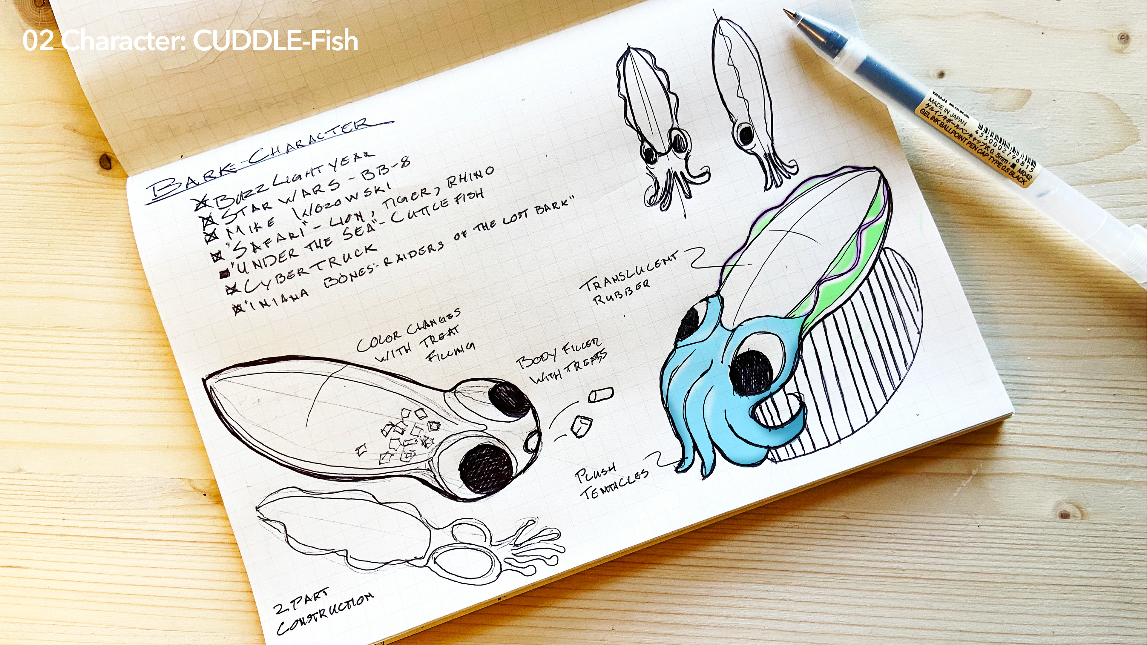 For the character prompt I wanted something that was dynamic and unique so I looked to underwater world for inspiration. This chew toy features a durable rubber body wrapped in plush tentacles. The body is translucent so the CUDDLE fish will change color depending on what treats are on the inside.