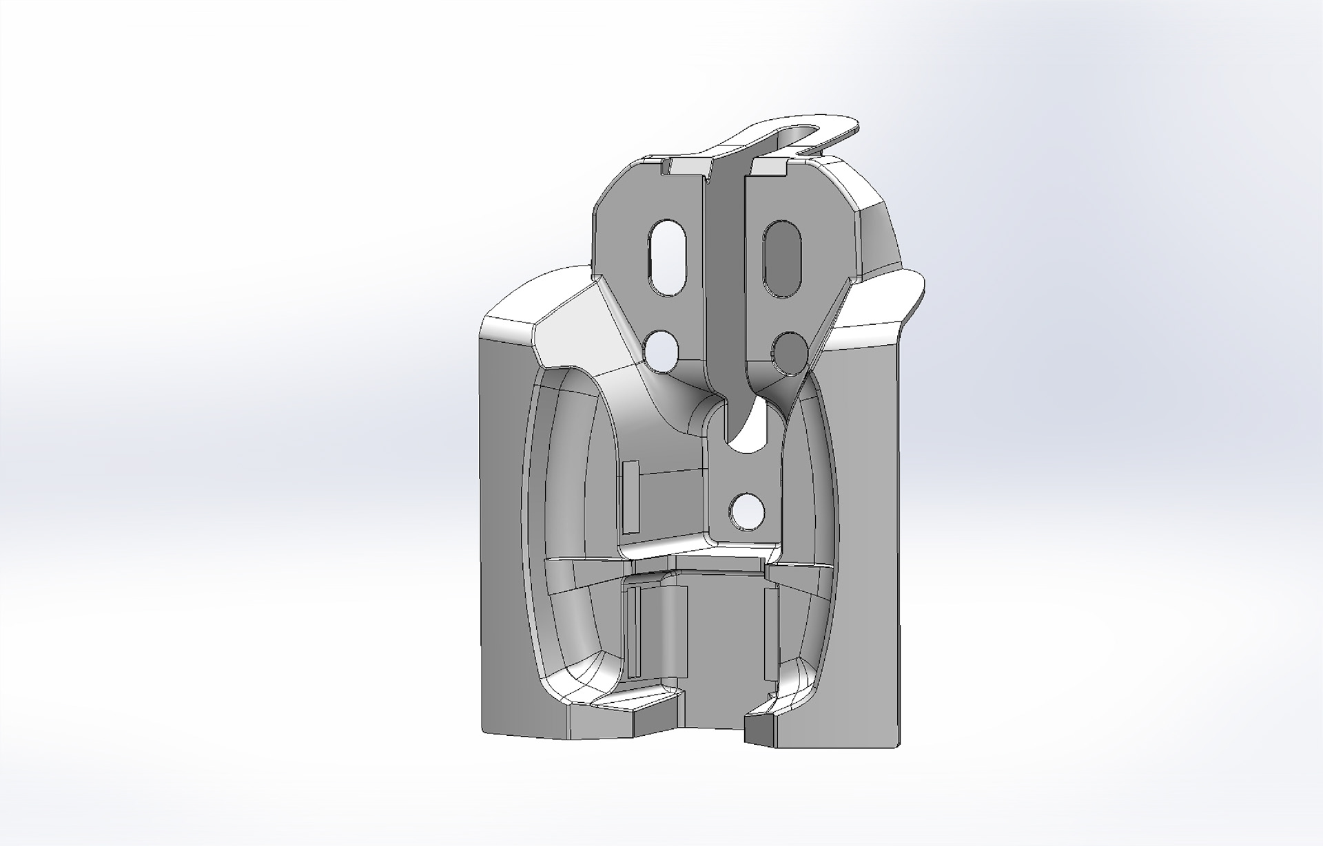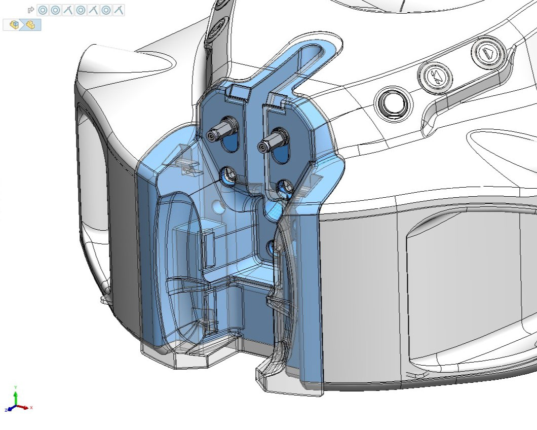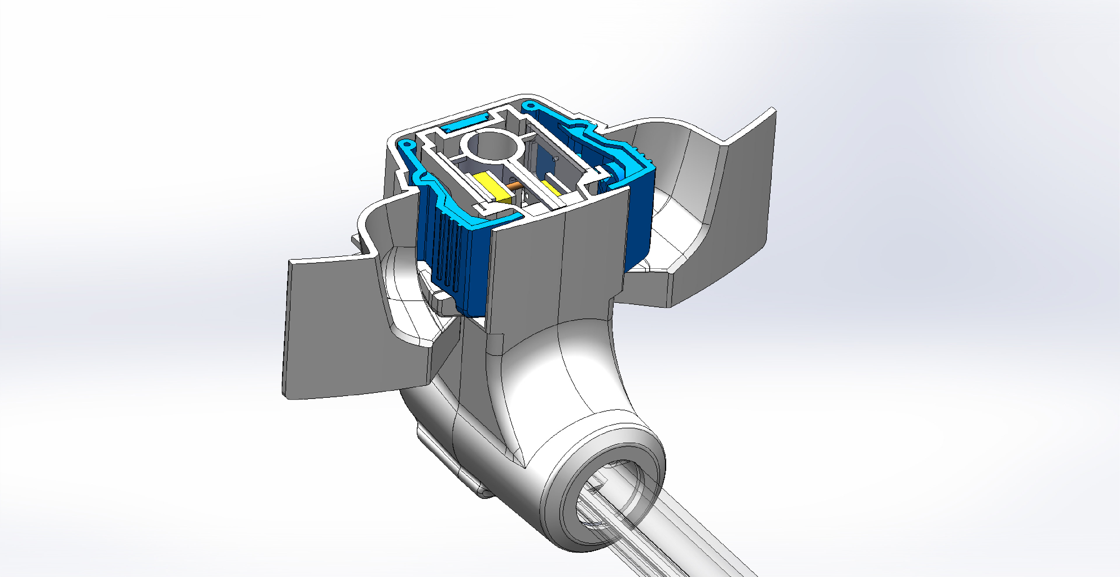 The selected design featured plastic injection molded housing sandwiched between two stamped stainless steel plates. This design would make the housing parts smaller and easier to manufacture via conventional methods. It also offered relatively smooth surfaces to make cleaning and reprocessing easier after every case.