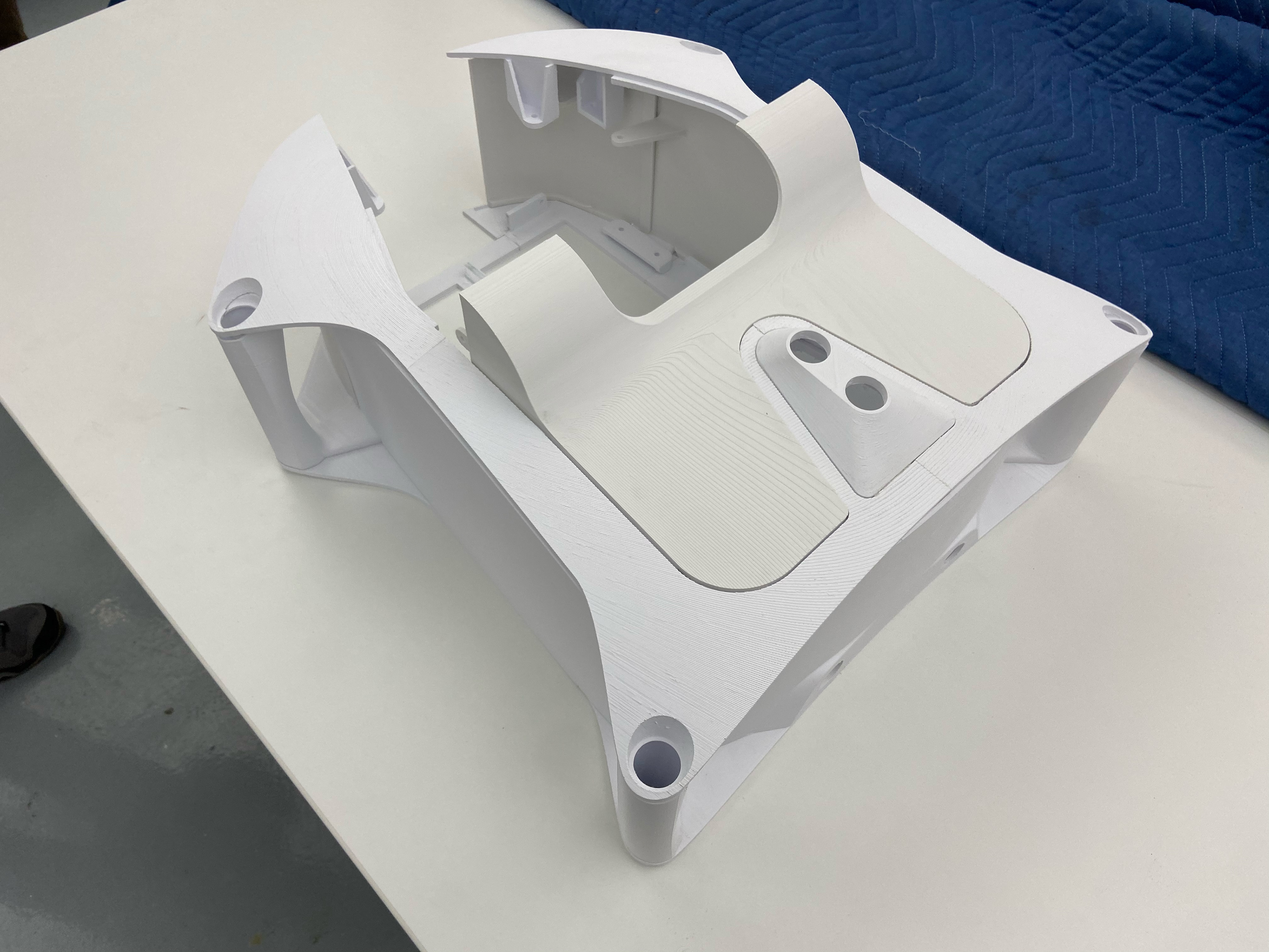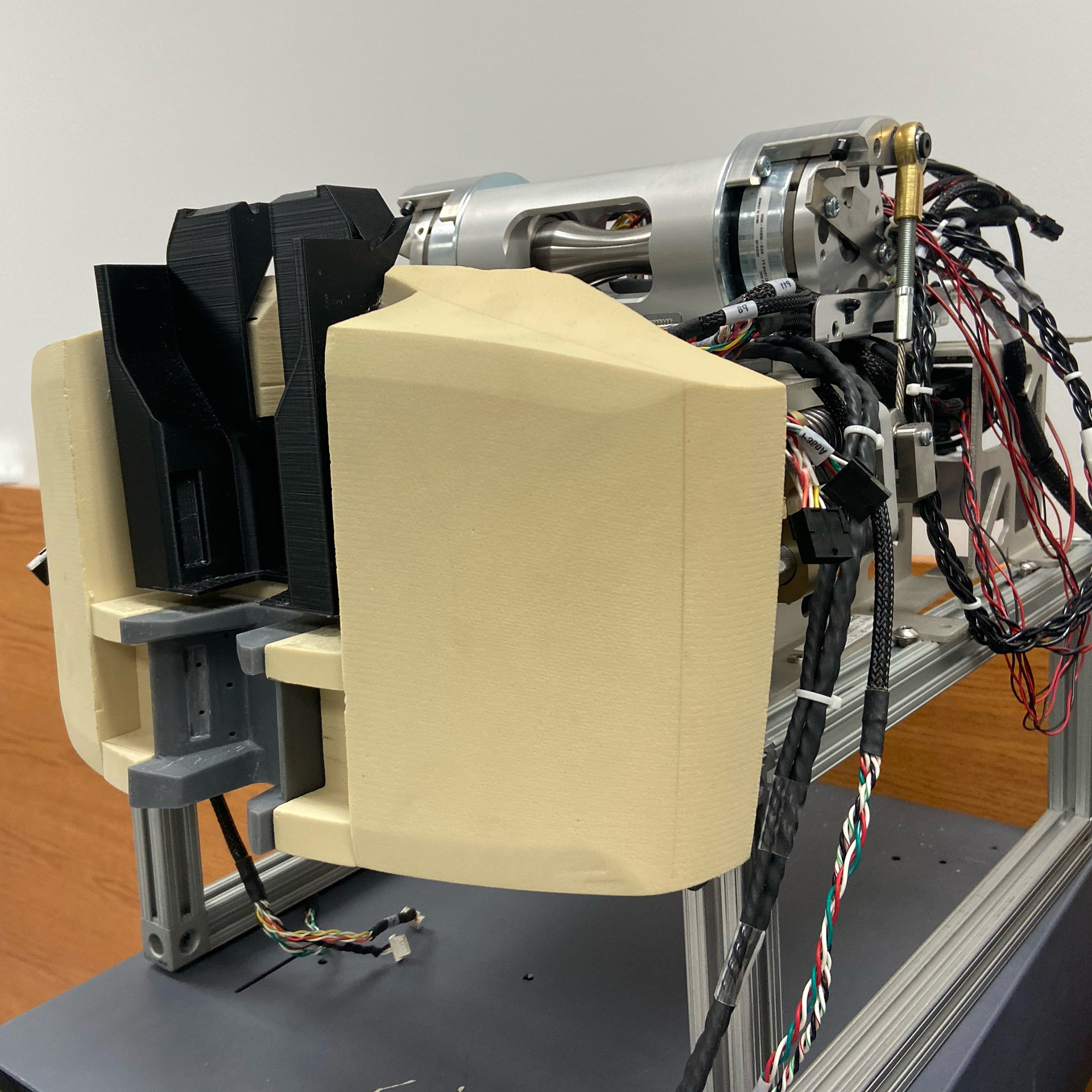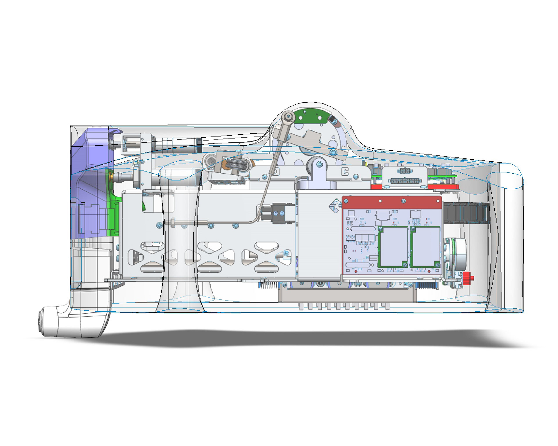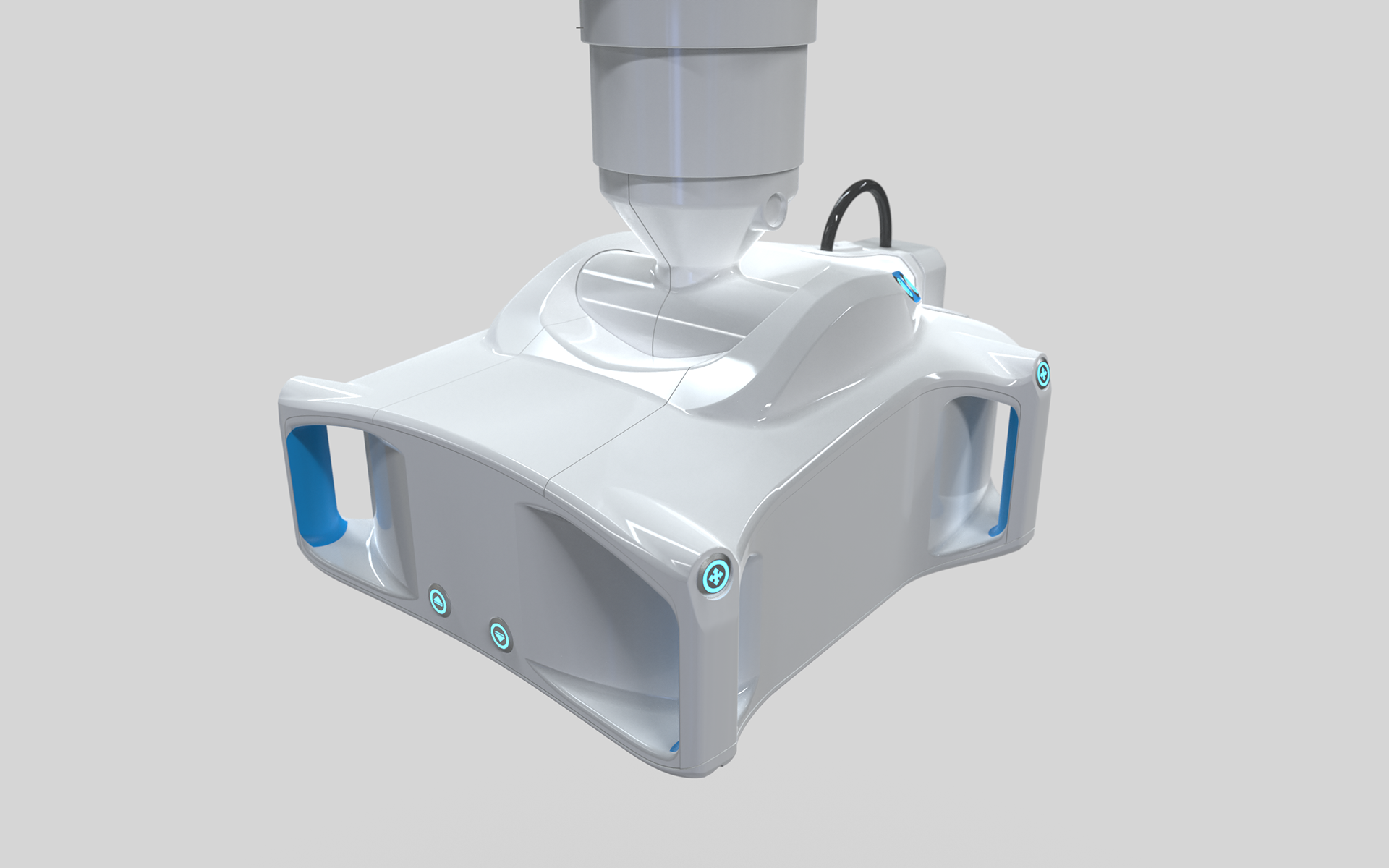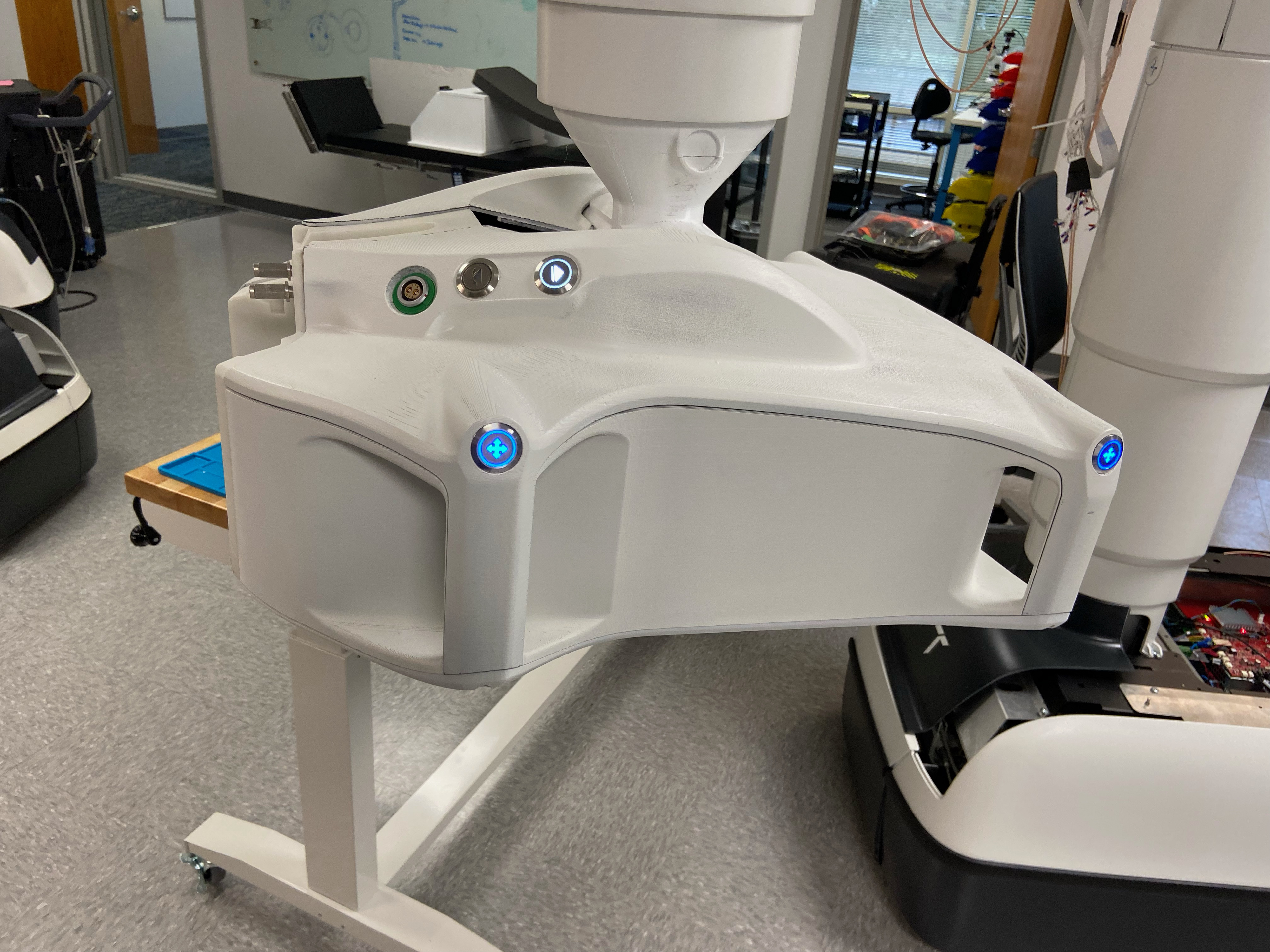 The final housings were 3D printed and painted to match the patient cart base. These housings were used in cadaver and pig labs to test the devices' reliability and function. The final production method was to have large housings cast out of urethane or molded via reaction injection molding.