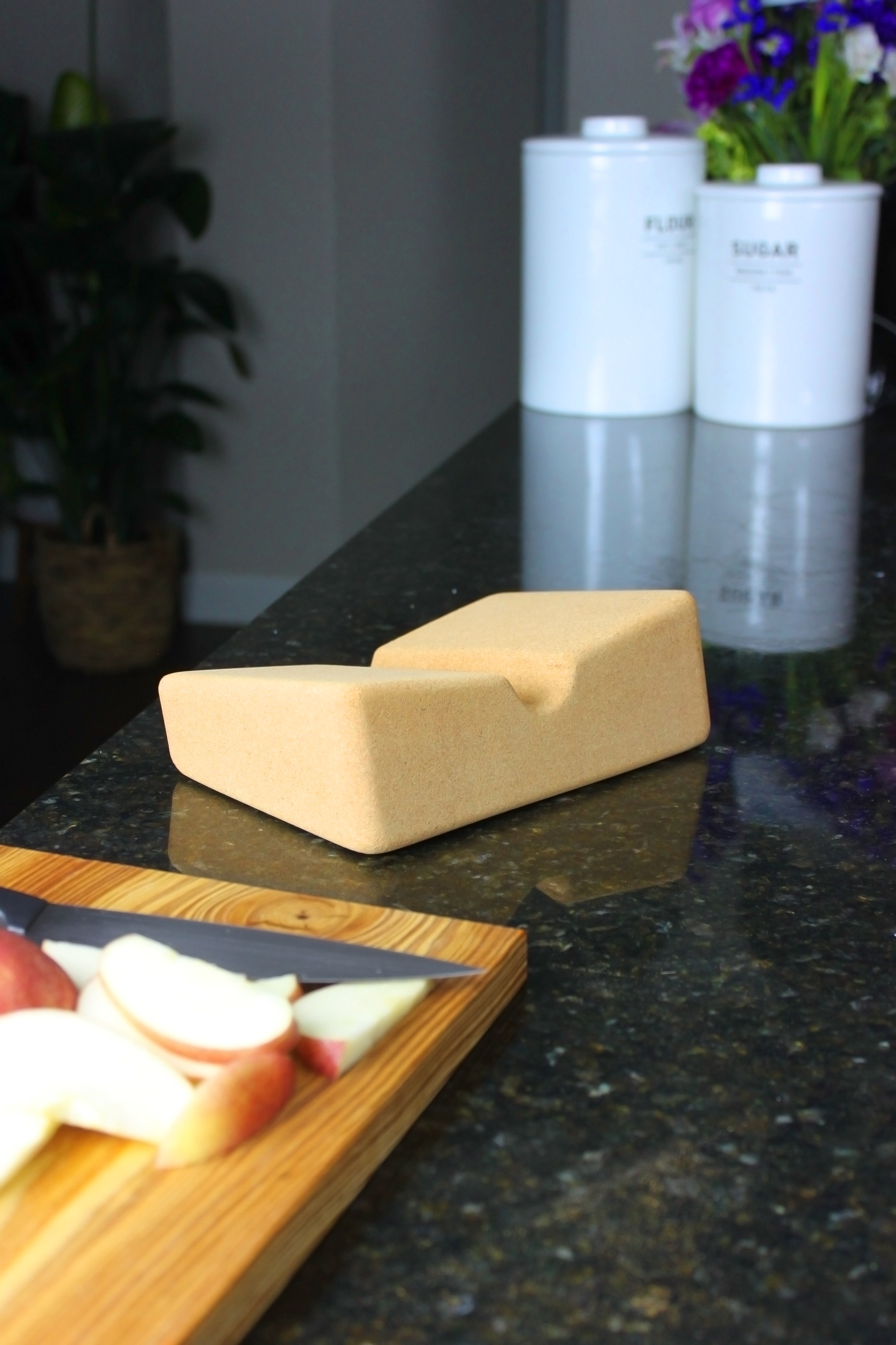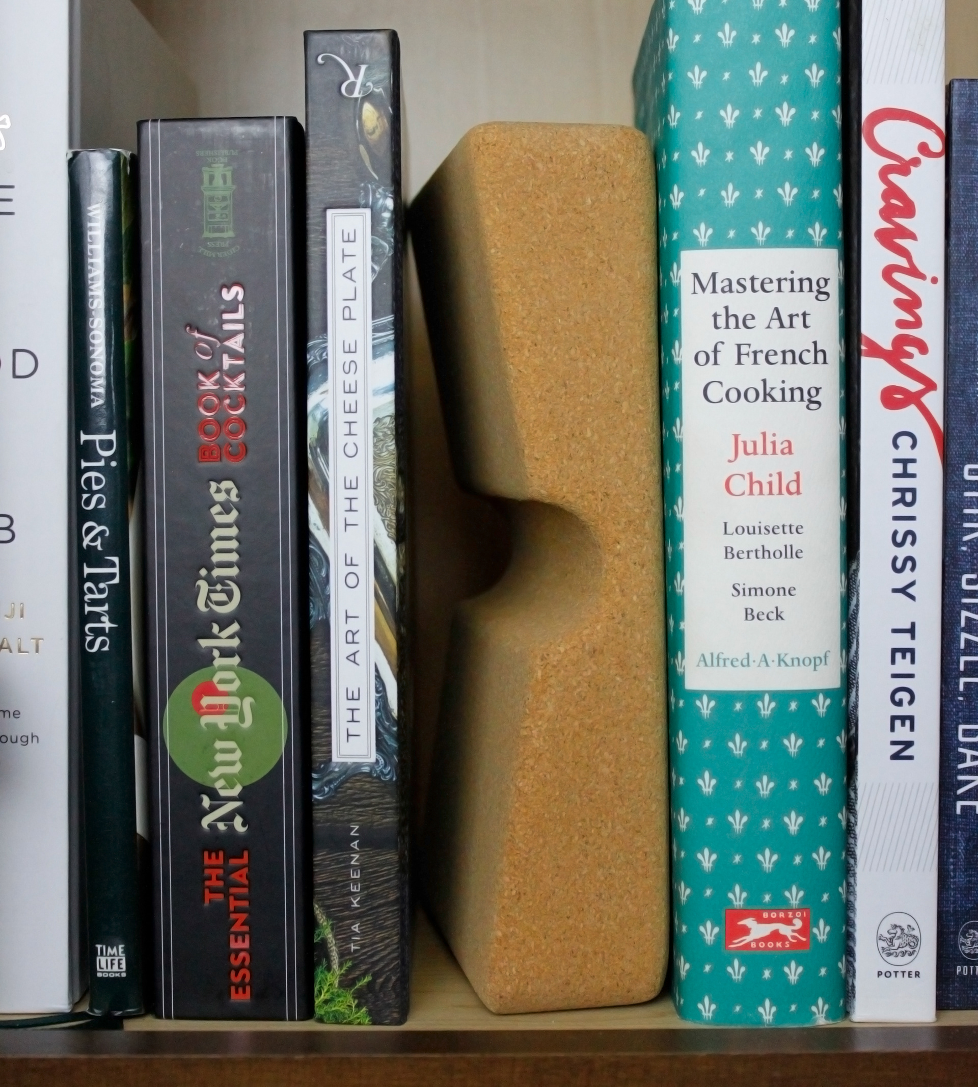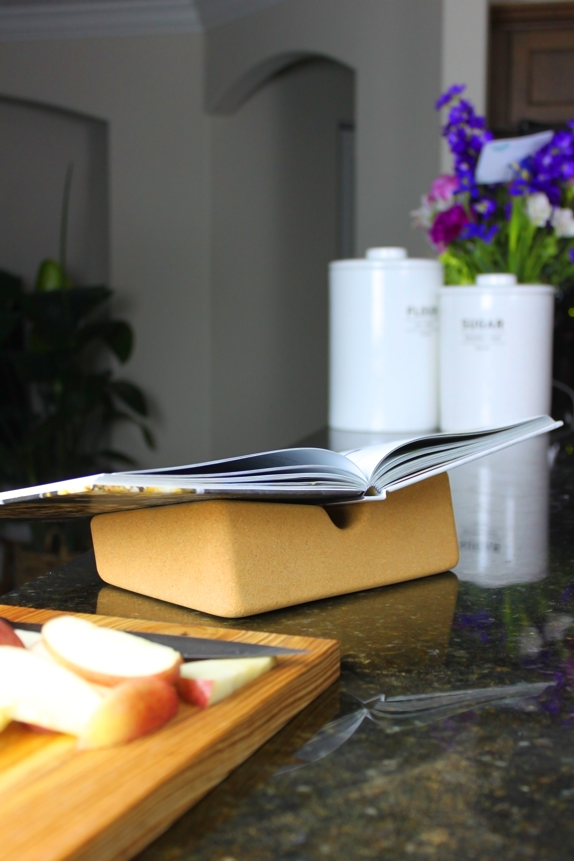A simple wedge of granulated cork that lifts books to a more comfortable angle for reading. It is especially effective with cookbooks by saving counter space and reducing the glare from overhead lighting. Lifting large books up to a better reading angle, it also protects the spine from damage.