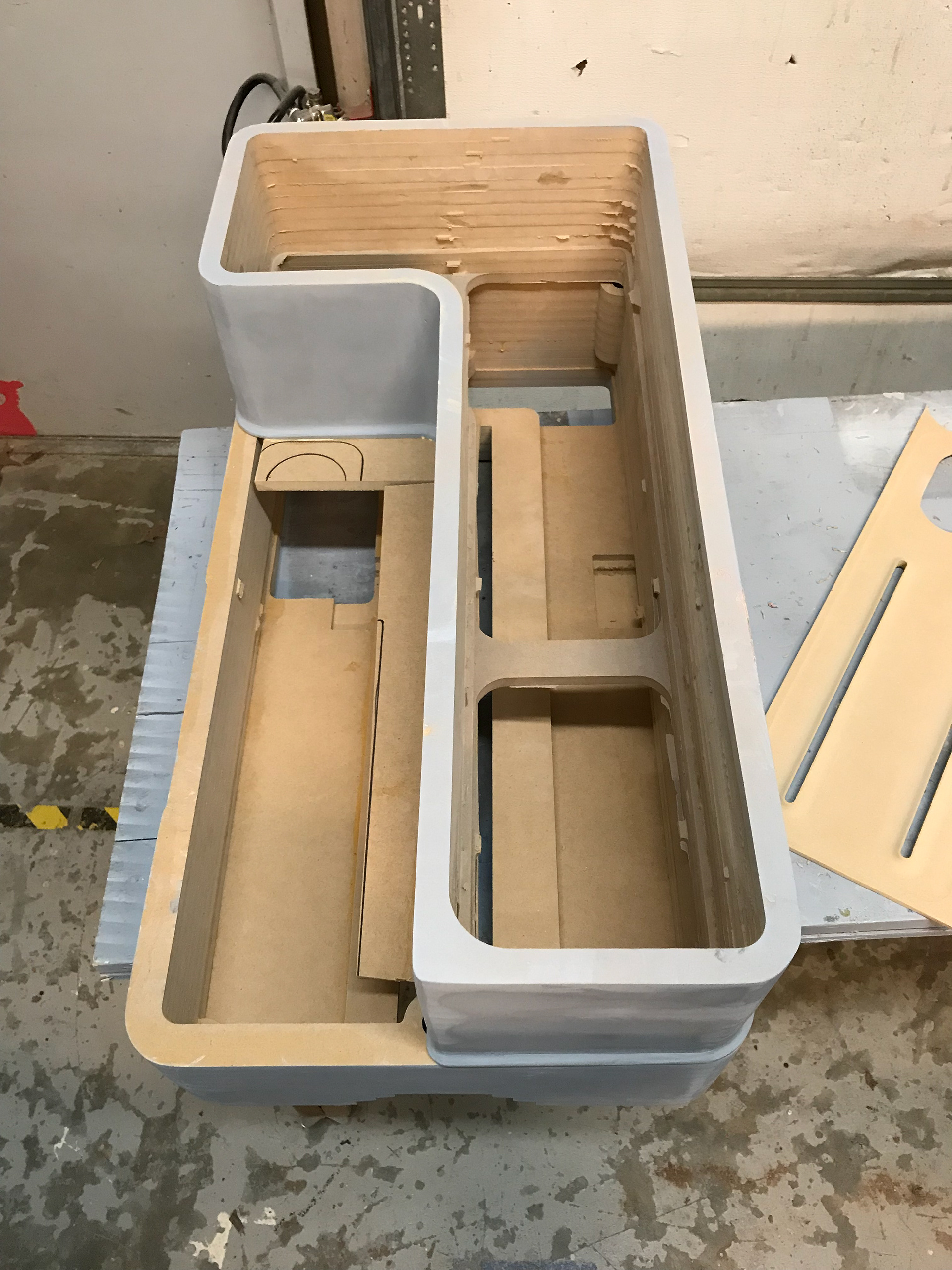 Hand built sizing prototype made from CNC cut and layered MDF. Then finished with single stage automotive grade lacquer. Complete with glass accessories and UI mock-up.