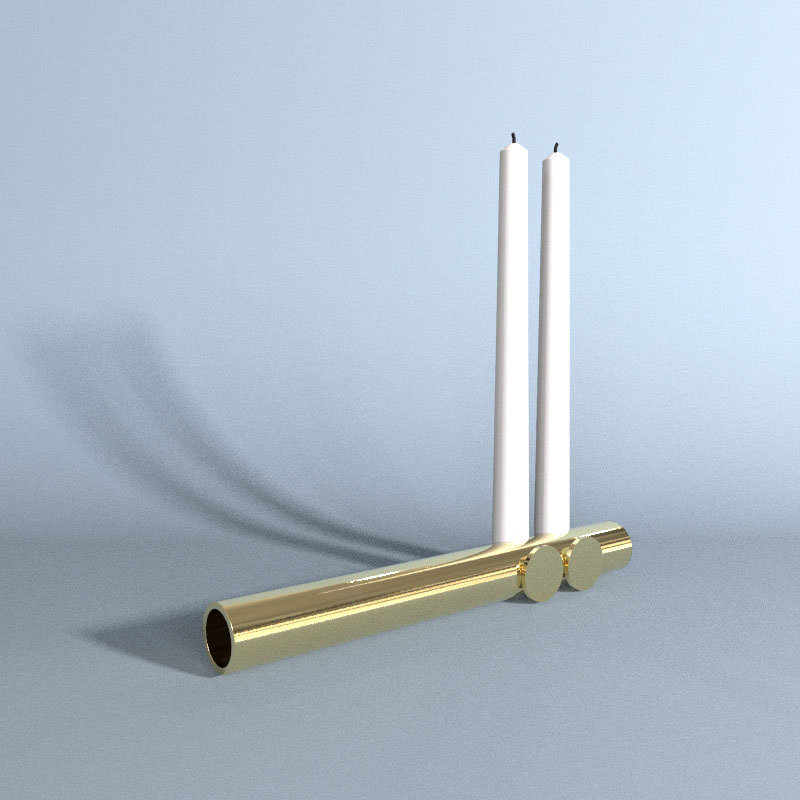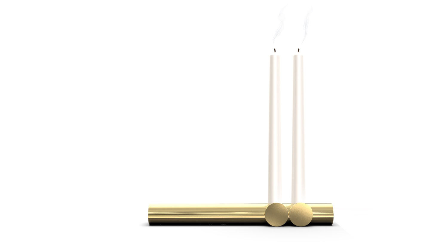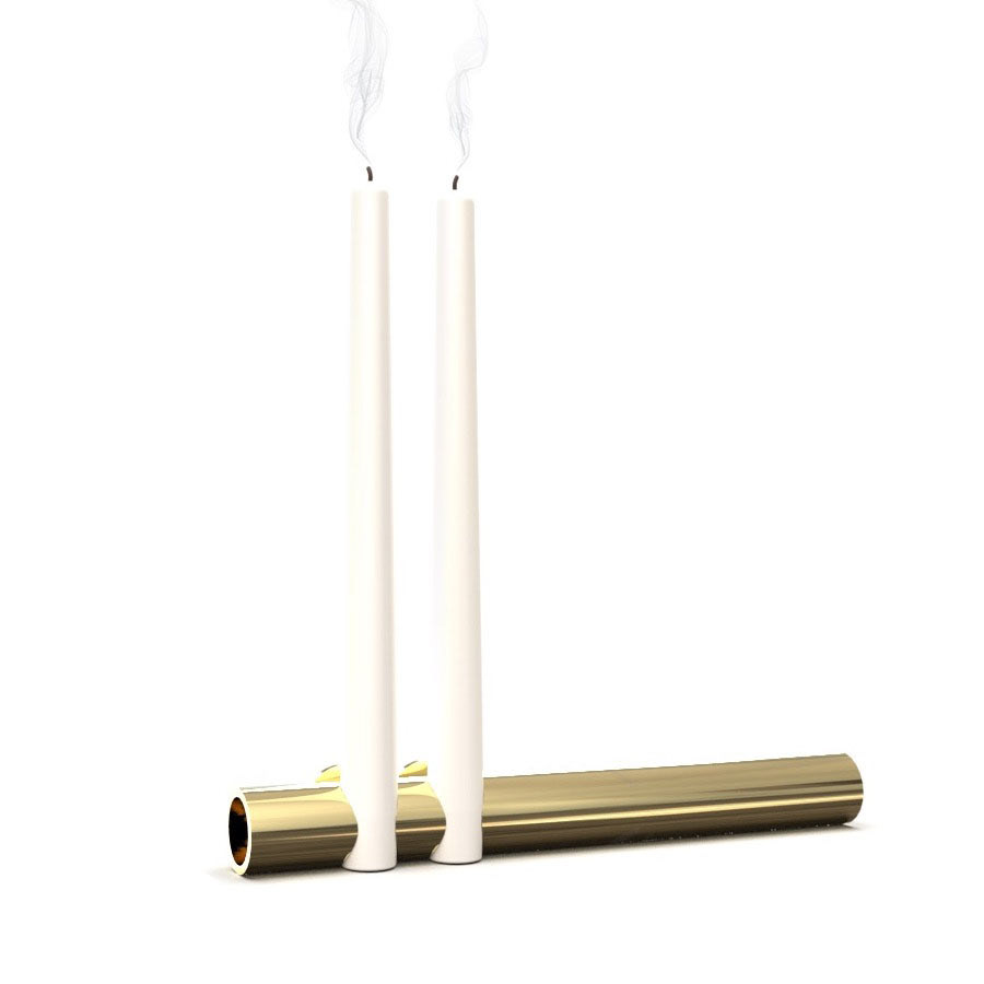 The sturdy brass pipe serves as a beautiful weight on the table or as a handle to transport the candles. The final effect is a beautiful asymmetric harmony.