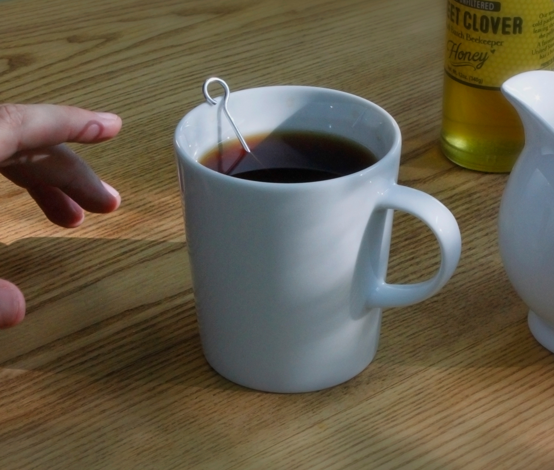 When the dipper is turned in the air, it keeps the honey trapped indefinitely. When stopped, the honey flows to the dish below. A well deserved bit of play in the morning routine.
