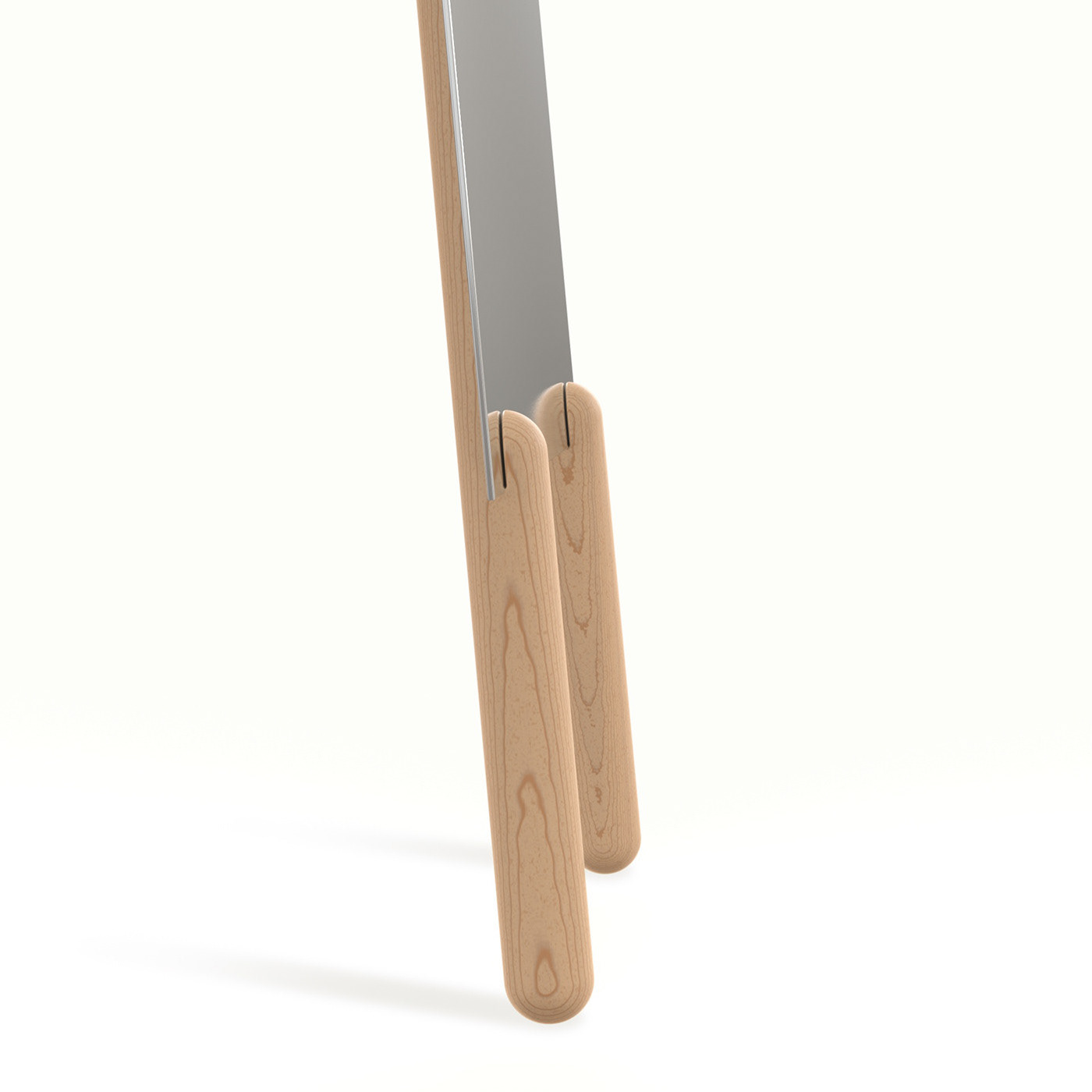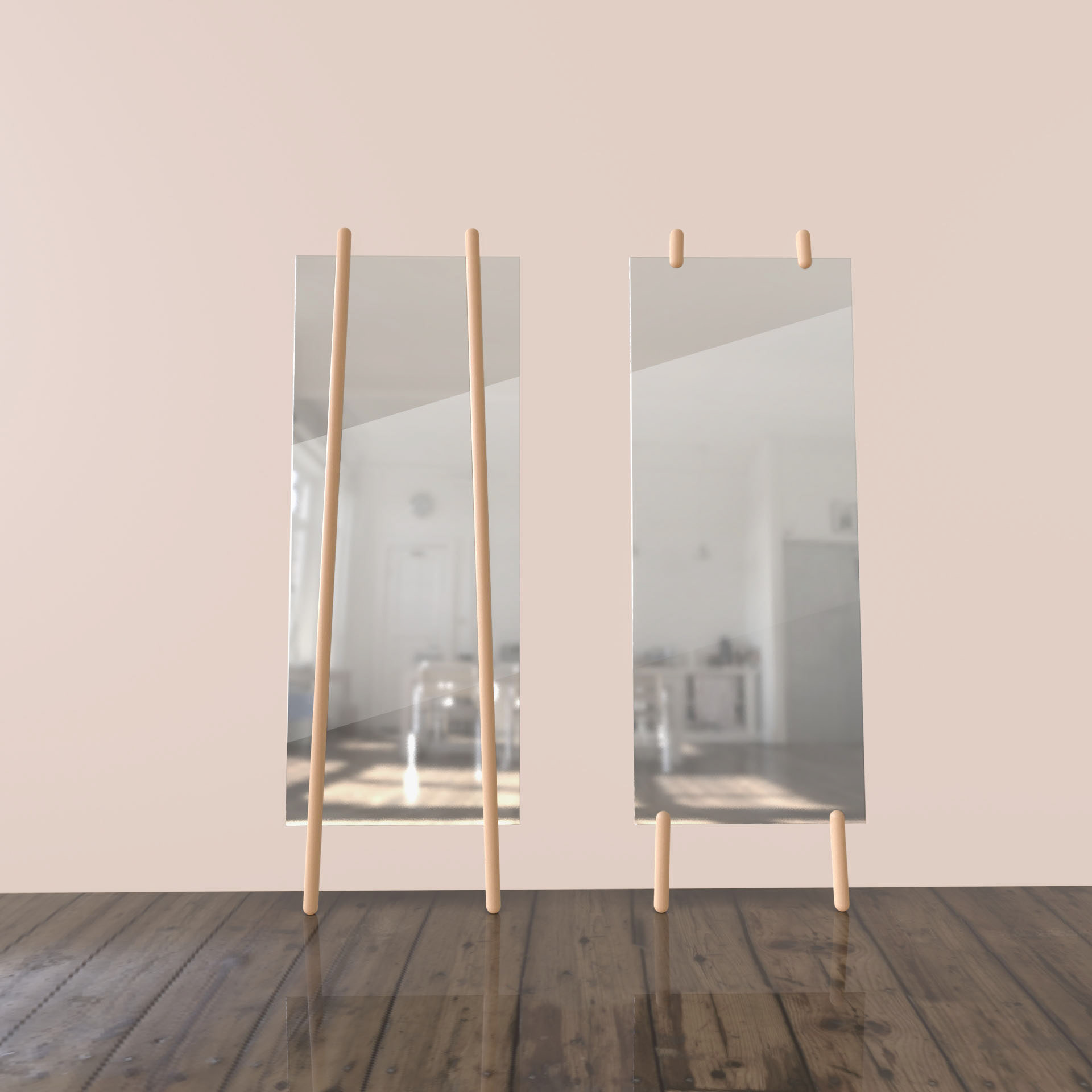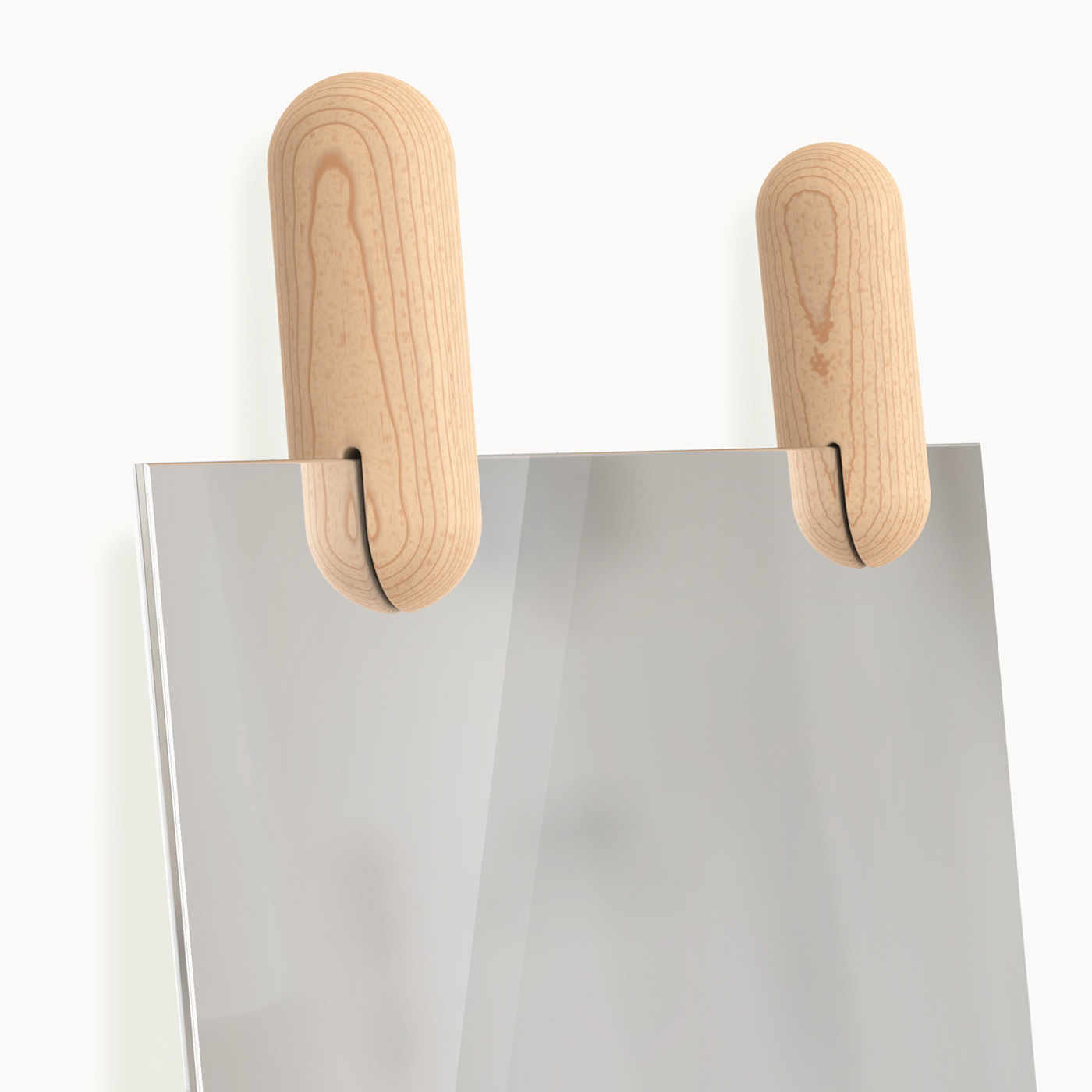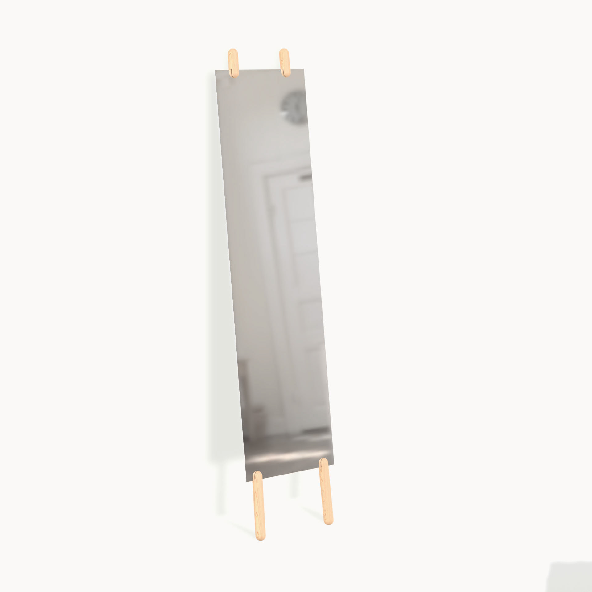 The stilts mirror is a 3 mm plate of reinforced glass held by two oak dowels. As the dowels splay slightly left and right, they grip the height of the mirror and lock into position.