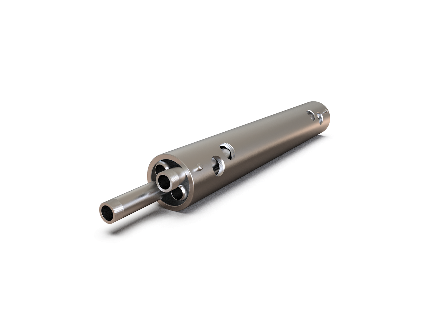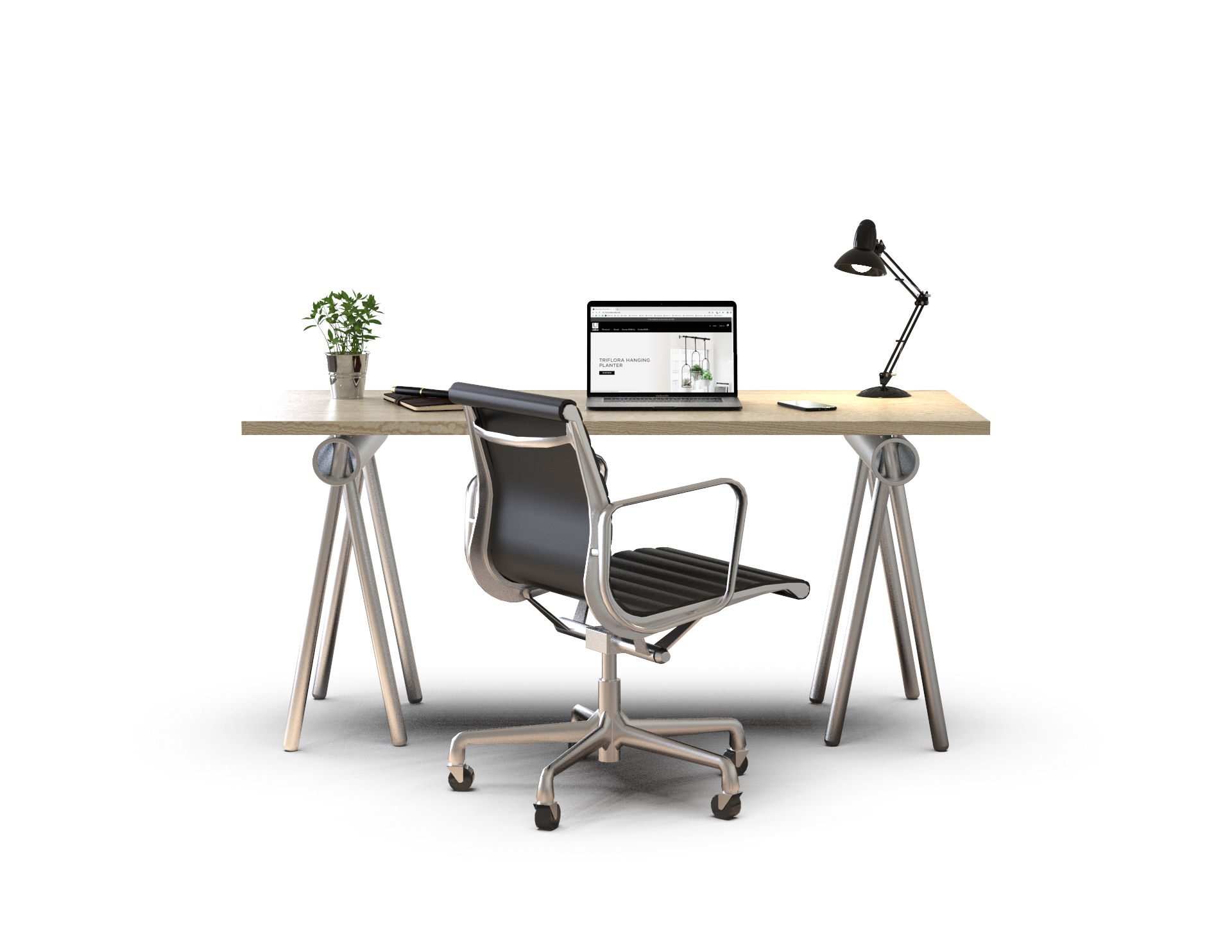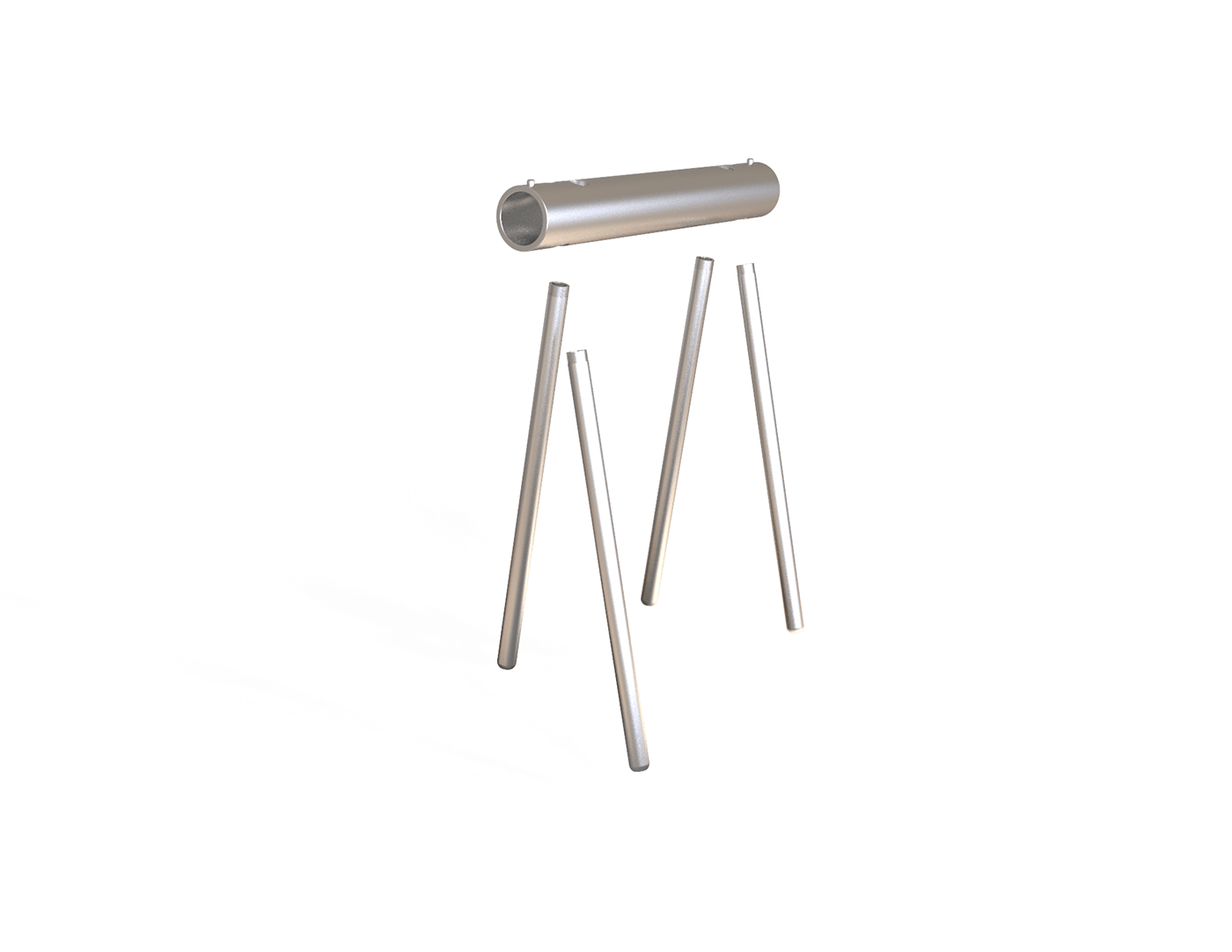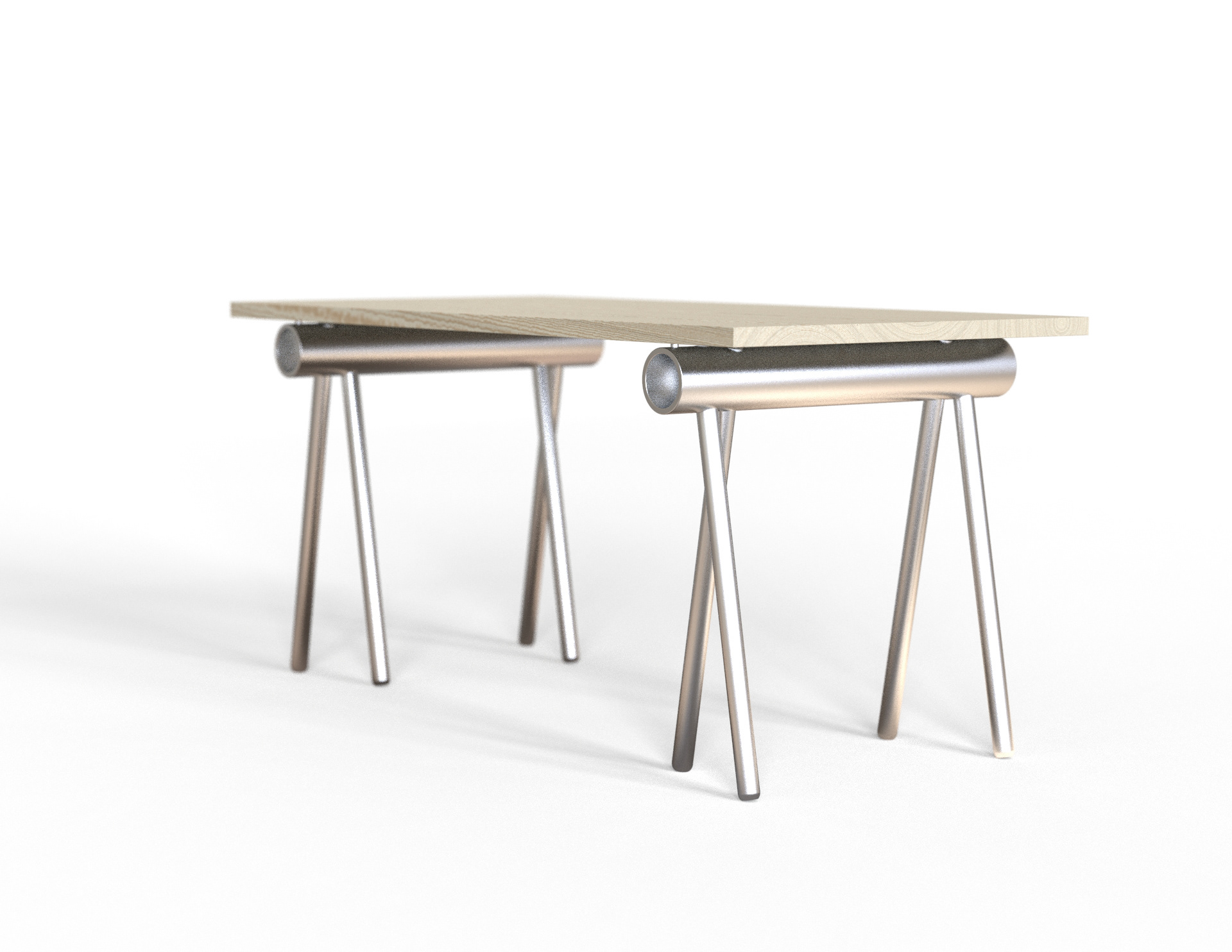 A clean, precise nomadic desk trestle made of aluminum tubes. The four legs efficiently nest into the large tube for delivery and transport.